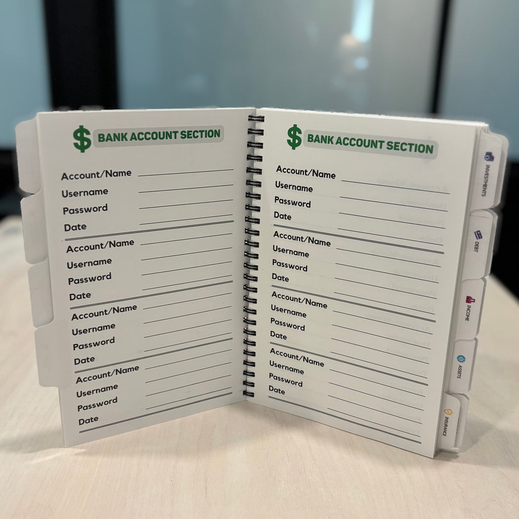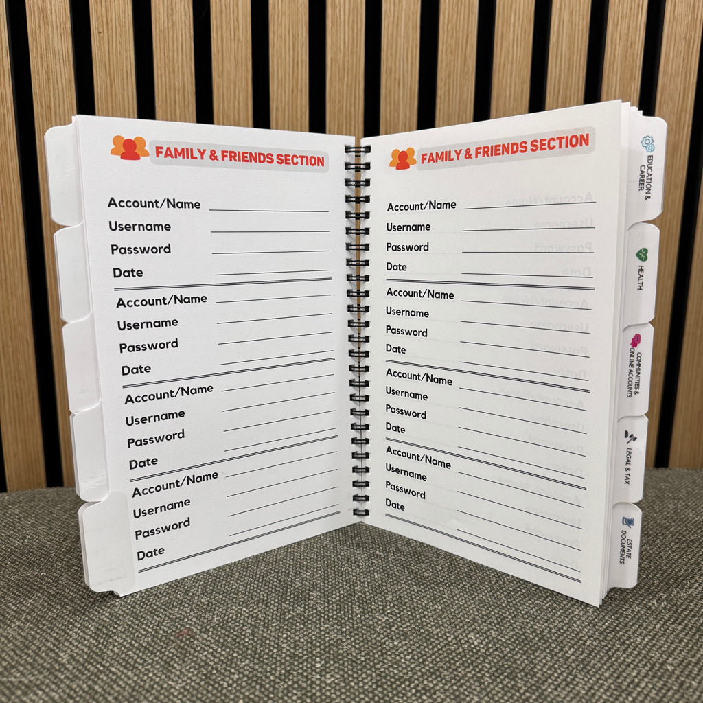 The Nokbox Companion Password Book has 16 tabbed, color-coded sections that mirror the Nokbox. This can be used in conjunction with the Nokbox or independently to capture all of your passwords.